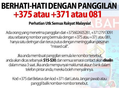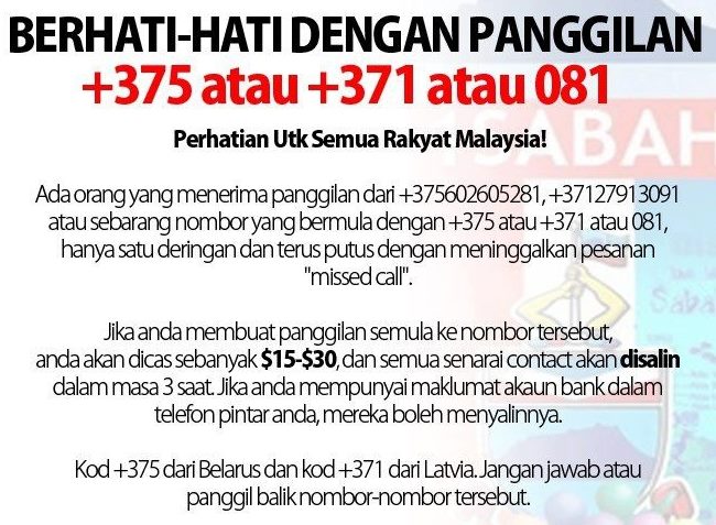 Orang ramai diingatkan agar tidak membuat panggilan kembali terhadap nombor luar negara +375602605281, 37127913091 atau mana-mana nombor yang bermula dari +375, +371 atau 081 (missed call/panggilan yang tidak dikenali).